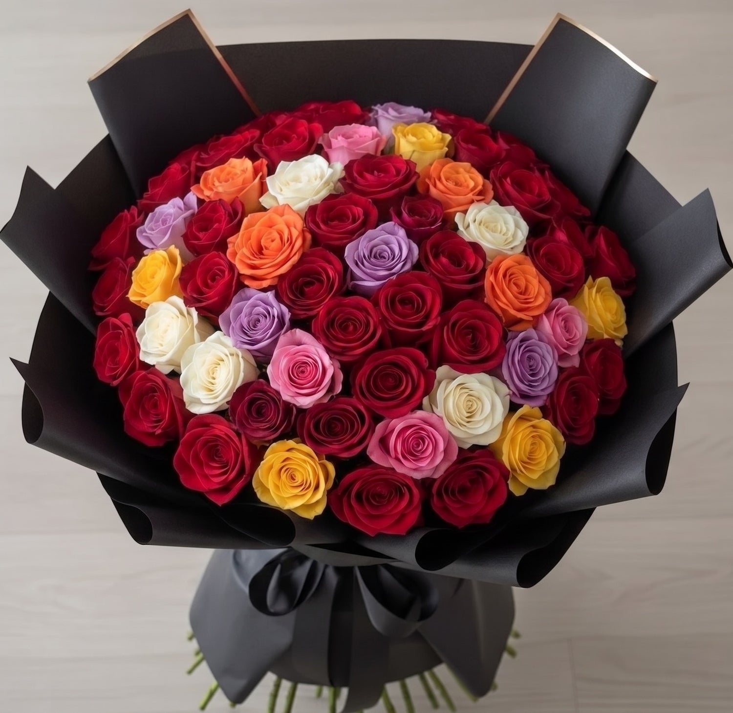 This breathtaking luxury bouquet features 100 hand-selected premium roses in a curated mix of colors, each with long stems that showcase their natural elegance and grace. The vibrant, multi-hued blooms bring together the symbolism of every rose color—love, joy, admiration, friendship, and celebration—making this the ultimate gift for any occasion that deserves a truly spectacular, unforgettable floral statement.