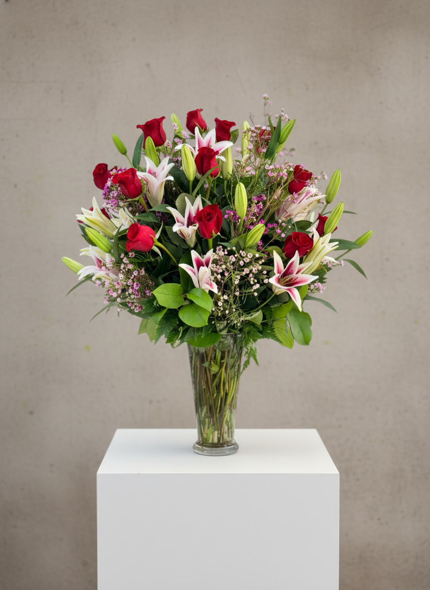 Dramatic, timeless, and unmistakably romantic,Grand Passion Eleganceis a luxurious floral arrangement designed to leave a lasting impression. Featuring an abundant display ofrich red rosesandstunning white lilies, this arrangement is accented with delicate filler blooms and layered with lush, vibrant greenery for depth and movement.