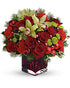 This Christmas bouquet stays true to its name! Merry details including red Christmas ornament balls, Douglas fir and variegated holly are mixed with bright green button chrysanthemums in a jolly red cube vase. Lush roses and carnations add to the seasonal splendor.